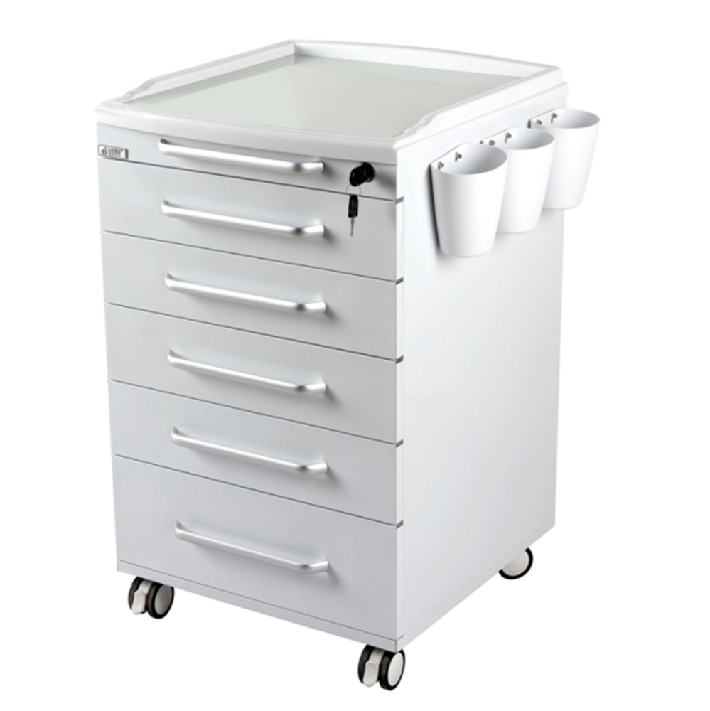 This is a professional mobile side cabinet designed for dental clinics, featuring a sleek, modern appearance and practical functionality.