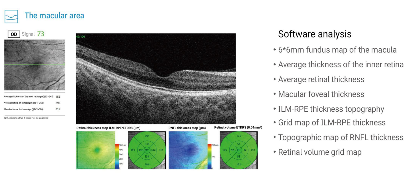 12mm X 9mm Large field scan; It coversboth the macular area and the optic discarea. Retinal disorders can be compre-hensively detected