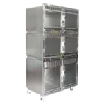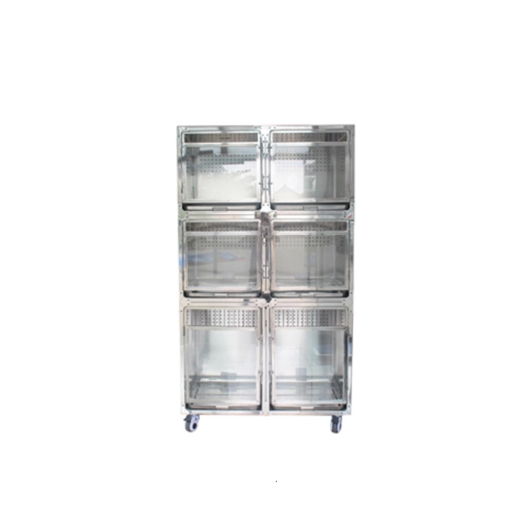 The Model SLZS-02 is a display cage designed for veterinary clinics or hospitals, providing six-door units made with high-quality stainless steel. It is easy to clean and maintain, with each cage providing essential features such as ventilation holes and a smooth finish to protect the animal from injury.
