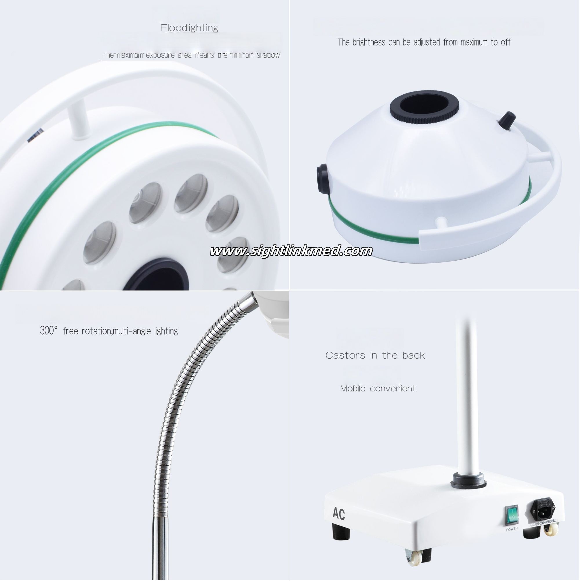 *High brightness, linear adjustable, daylight color, long lifetime.*Base castor configuration, easy to move;