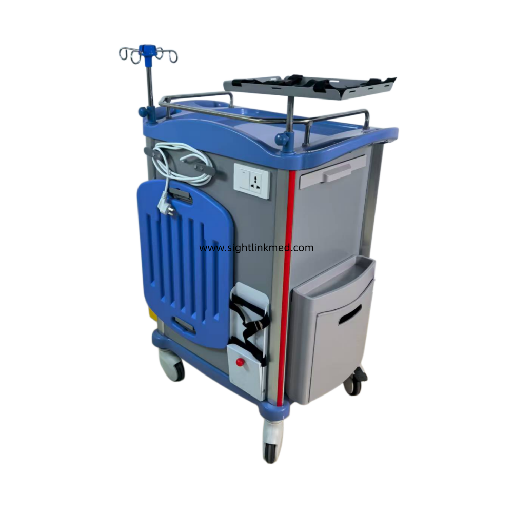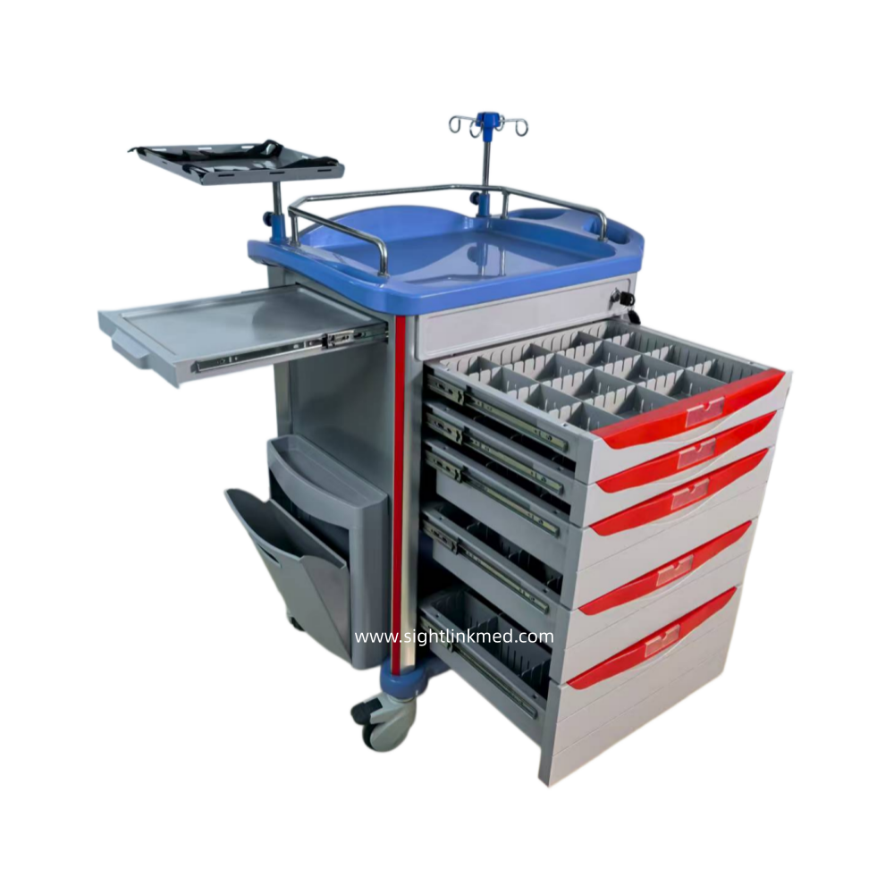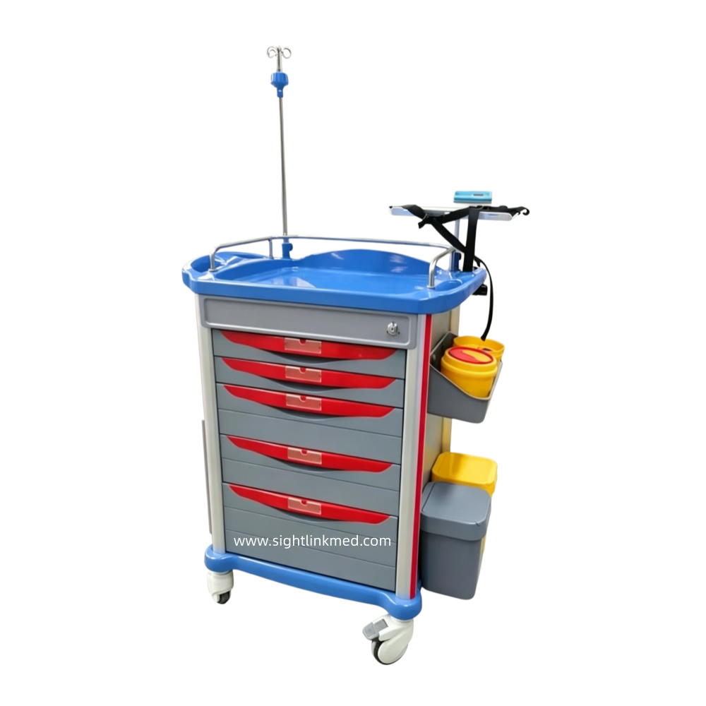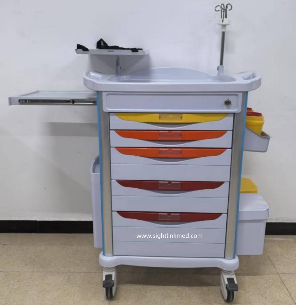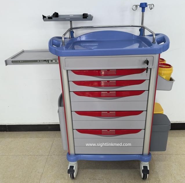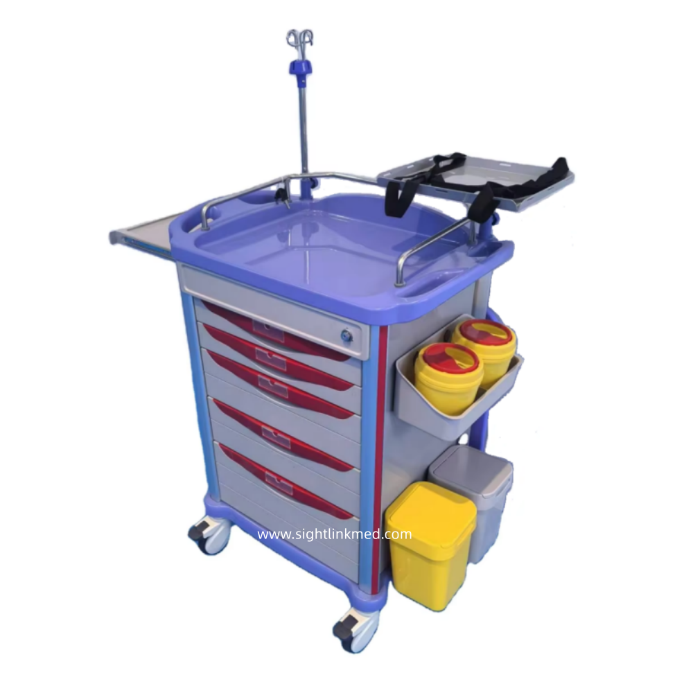 - Configuration: 2 small drawers, 2 medium drawers, 1 large drawer, 1 side writing board, 1 flip-top waste bin, 1 side hanging box, 2 sharps containers, 2 Type B waste bins, 1 rotating tray, 1 set of telescopic infusion stand, 1 oxygen cylinder holder, 1 resuscitation board, 1 set of 220V power cord and socket.