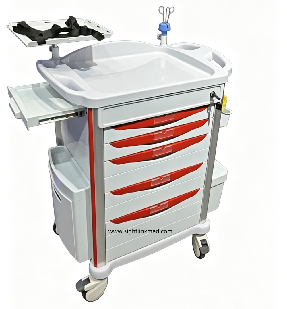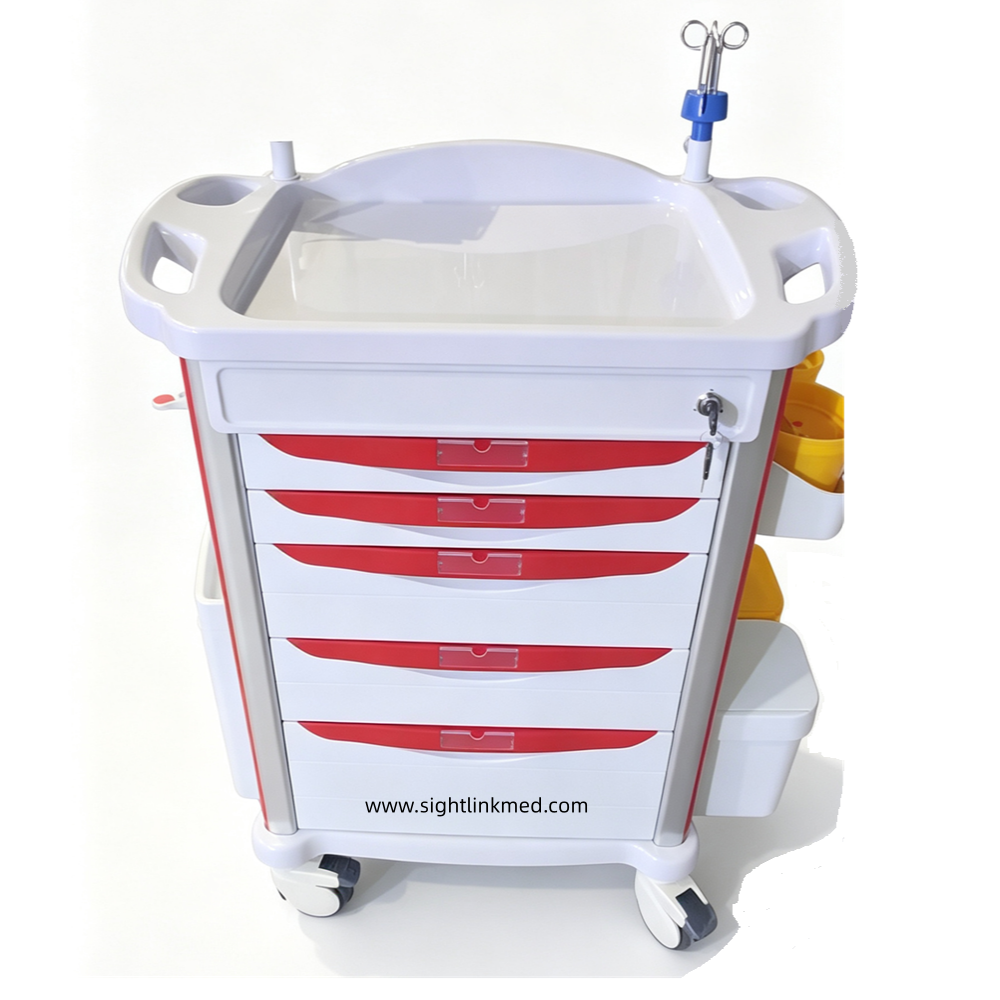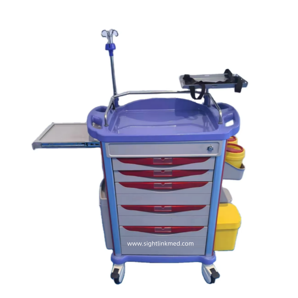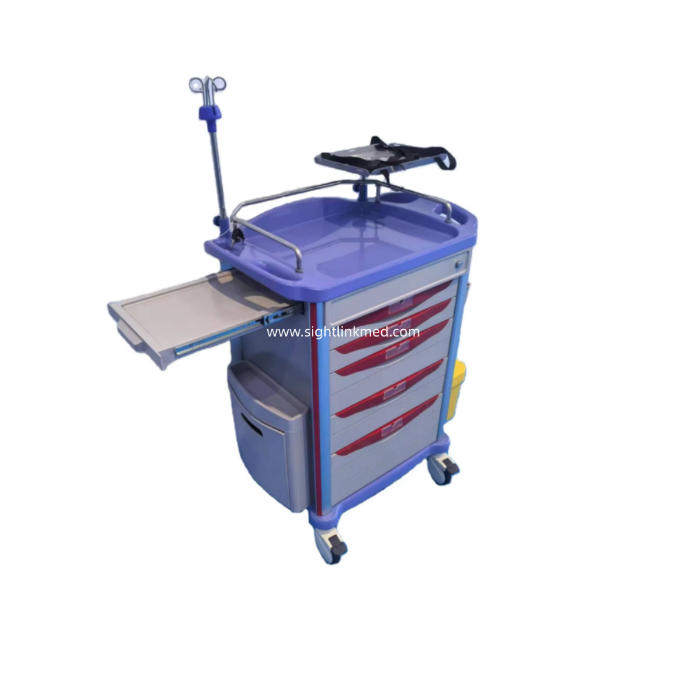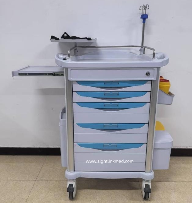 - Configuration: 2 small drawers, 2 medium drawers, 1 large drawer, 1 side writing board, 1 flip-top waste bin, 1 side hanging box, 2 sharps containers, 2 Type B waste bins, 1 rotating tray, 1 set of telescopic infusion stand, 1 oxygen cylinder holder, 1 resuscitation board, 1 set of 220V power cord and socket.