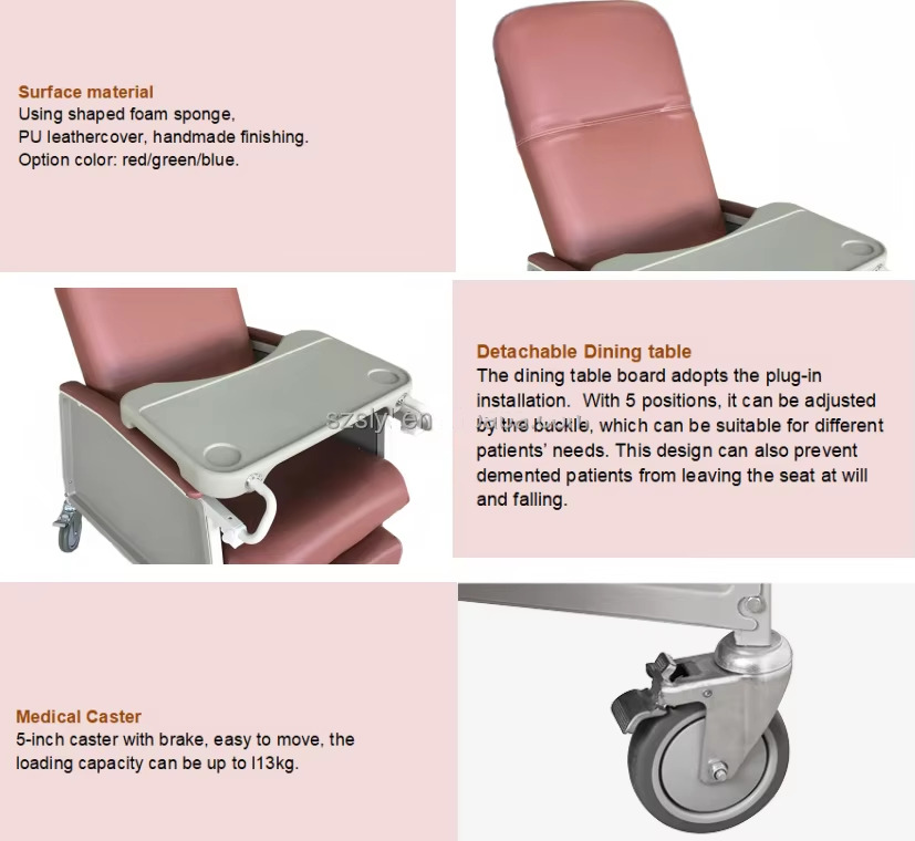 This hospital reclining chair is designed for versatility and patient comfort, featuring a manual recliner with four adjustable sections (back, hip, leg, foot) and a 5-inch caster with brake for easy mobility and stability. It supports safe working loads up to 113kg and includes a blow-molded tray with 5 adjustable positions, catering to various medical needs such as dialysis, blood collection, and cardiac care.
