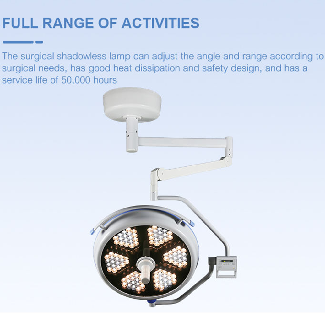 The surgical shadowless lamp can adjust the angle and range according tosurgical needs, has good heat dissipation and safety design, and has aservice life of 50,000 hours.