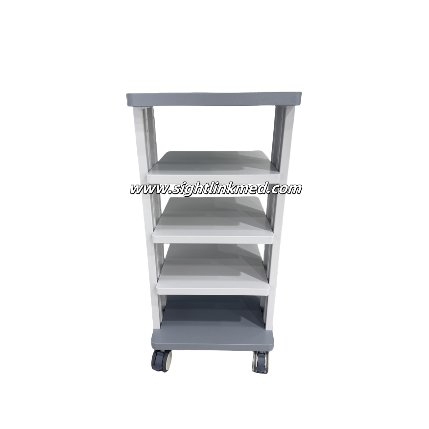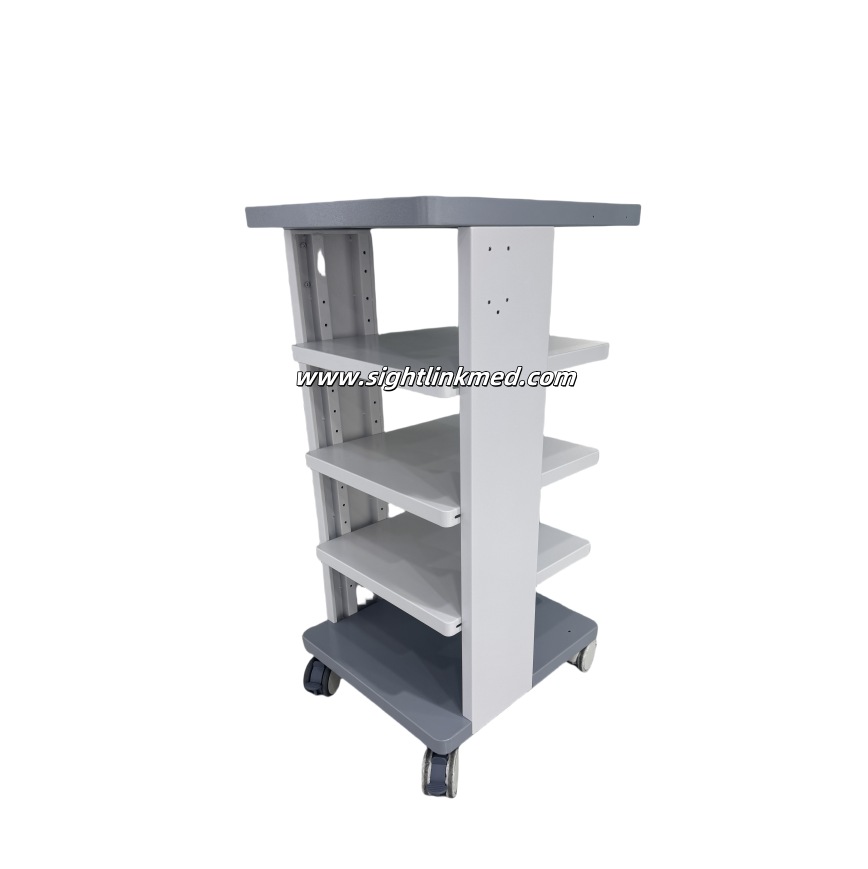 This Endoscopic Cart is equipped with a arm, a keyboard and mouse support bracket, a mouse shelf, a telescopic infusion rod (two hooks), three cable rack (U shape) and three equipment pallets.
