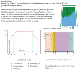 2. Compared with the autoclave with a longer sterilization cycle, this quicker autoclave prolongs the lifetime of the medical appliances relatively, because the cycle time of the sterilized appliances exposed to the high temperature is less.