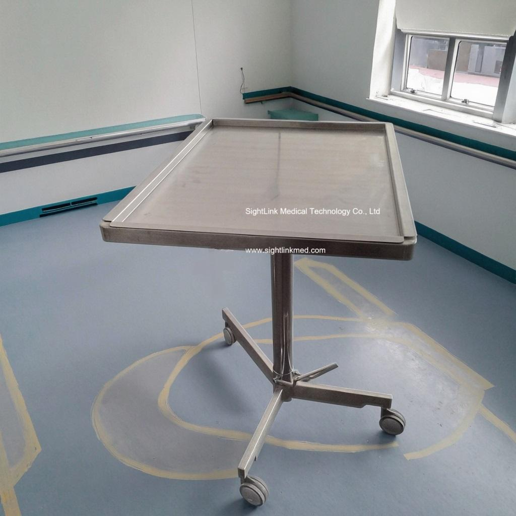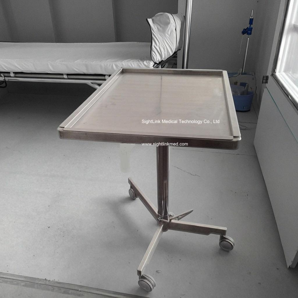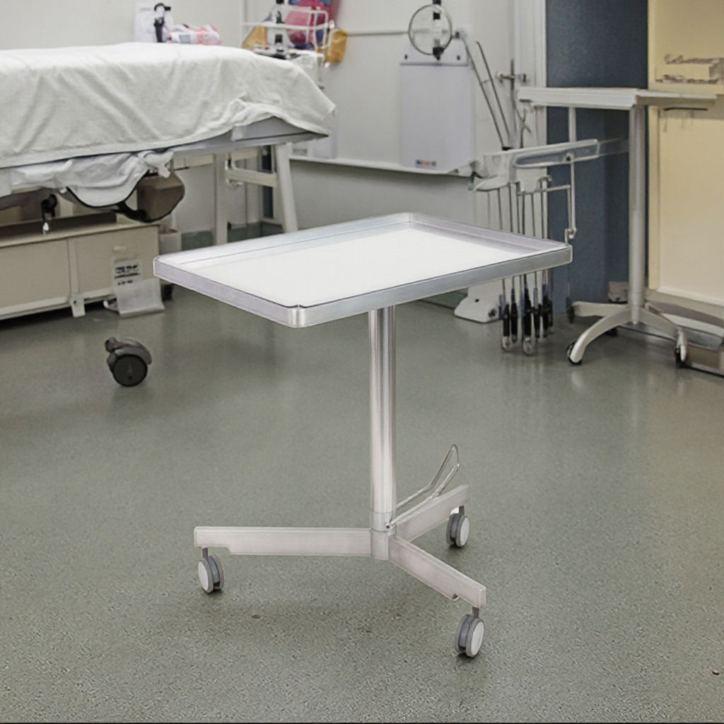 This stainless steel ophthalmic instruments mayo trolley is designed for durability and functionality, featuring a fully rotatable tray, hydraulic height adjustment via foot pedal, and a three-armed base with castors for mobility.